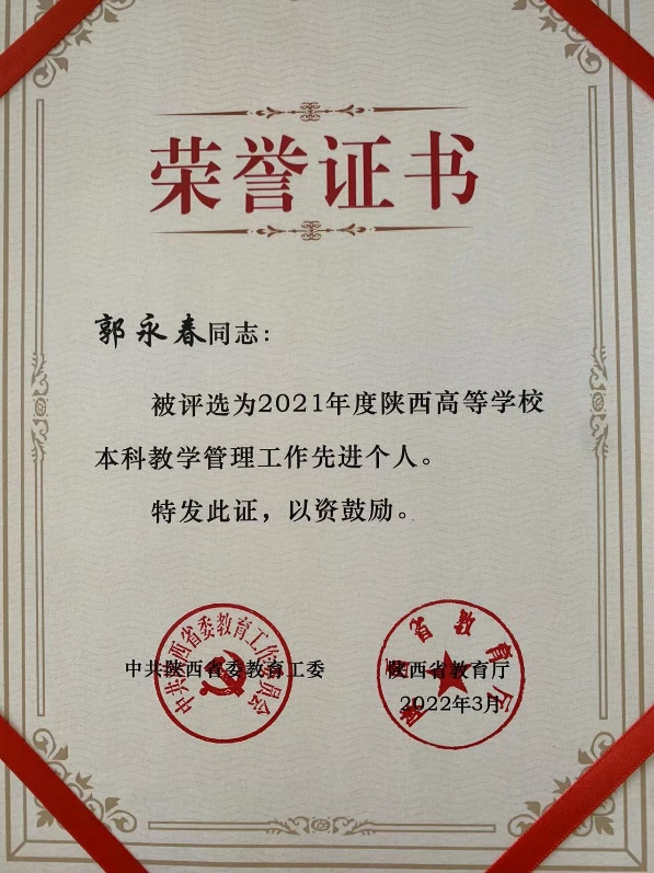公司郭永春同志被陕西省委教育工委评选为2021年度陕西高等公司本科教学管理工作先进个人。表彰他在2021年度的工作表现。