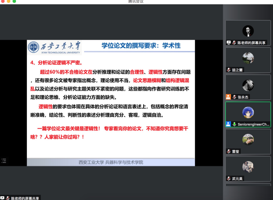 讲座题目:西安工大研究生学位论文规范,主讲人:陈丁,博士、高级工程师、硕士生导师。主要研究方向:兵器数字化试验测试技术、雷达系统总体设计与建模。中国电子学会高级会员、中国仪器仪表学会高级会员、IEEE会员,多个SCI及中文核心期刊评审专家。发表学术论文90余篇,其中SCI、EI收录20余篇。多次获得相关学术会议、科技成果奖。