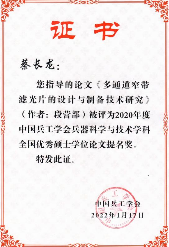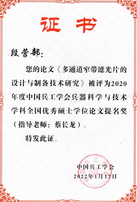2022年1月17日,中国兵工学会公布了第五届兵器科学与技术学科全国优秀博士、硕士学位论文评选结果。本次评选共评出19篇优秀学位论文及提名奖,其中优秀博士学位论文4篇,优秀博士学位论文提名奖4篇,优秀硕士学位论文10篇,优秀硕士学位论文提名奖1篇。公司兵器科学与技术学科硕士生段营部的硕士学位论文“多通道窄带滤光片的设计与制备技术研究”荣获优秀硕士学位论文提名奖,这是公司首次获此殊荣。