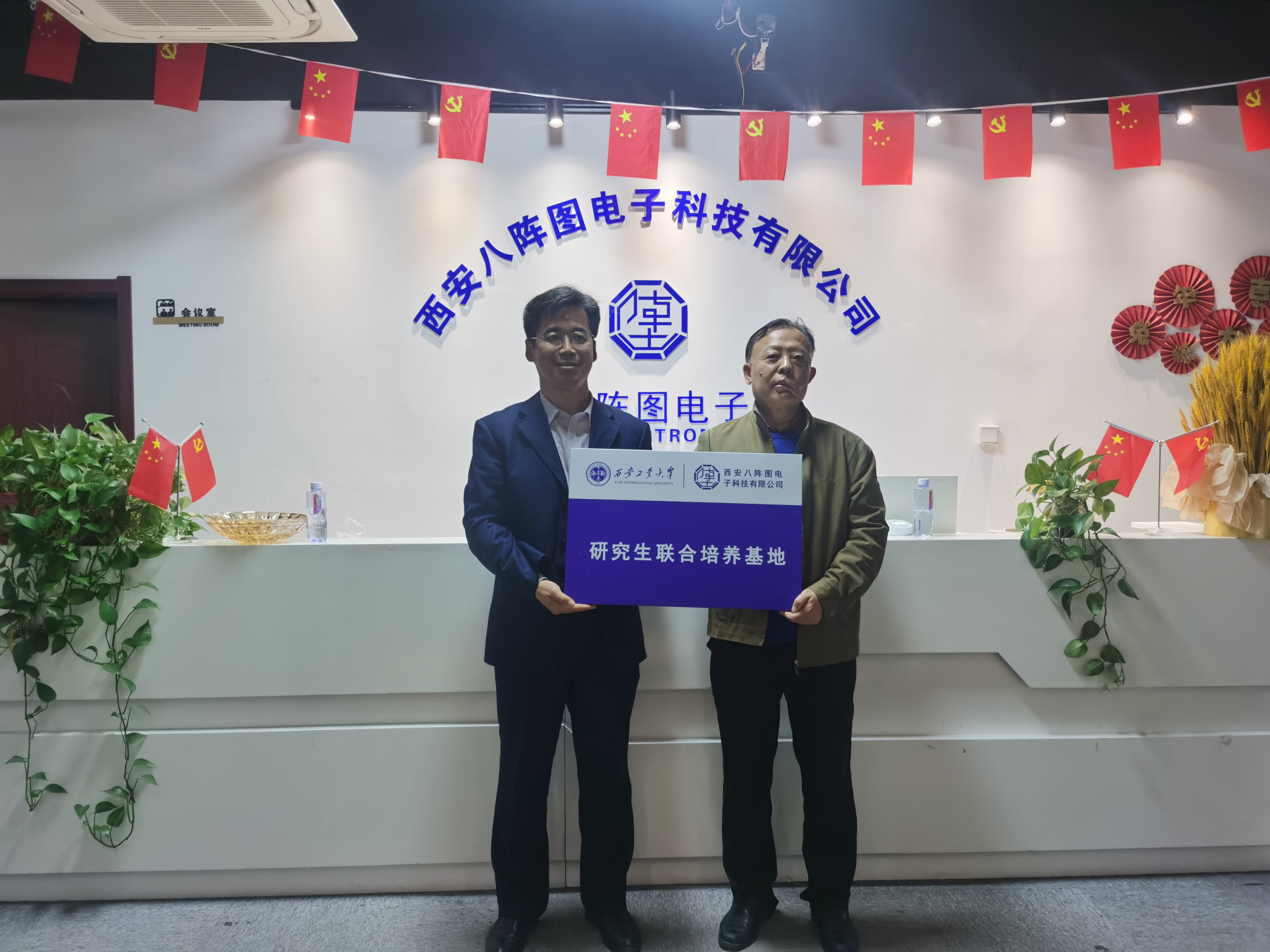 随后,郭永春经理一行前往西安八阵图电子科技有限公司进行交流、参观,由该公司总工程师朱亚鹏,总体部负责人董吉印负责接待。校企双方就军民融合、科研合作、人才培养等方面开展深入探讨。会后,双方举行“365英国上市集团和西安八阵图电子科技有限公司研究生联合培养基地”授牌仪式。