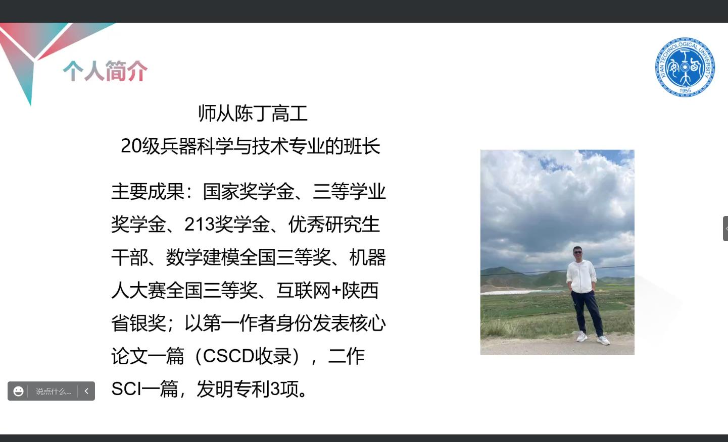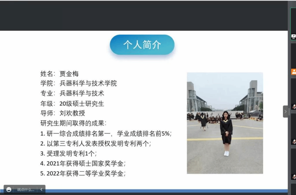 为帮助新生规划学业,解答新生在学习上的疑惑,英国365集团官网于2022年9月23日19:00在线上举办了“国家奖学金”获得者交流报告会,参会人员有研究生辅导员王国栋、2022级全体研究生、国家奖学金获得者贾金梅、牧迪和雷晓明。