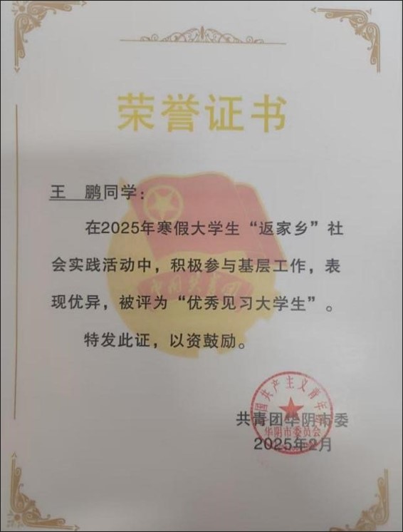 2025年寒假期间,23级武器系统与工程专业本科生王鹏、张智超积极响应公司以及公司关于“返家乡”社会实践的号召,分别在华阴市罗敷镇政府与华阴市委统战部实习工作。