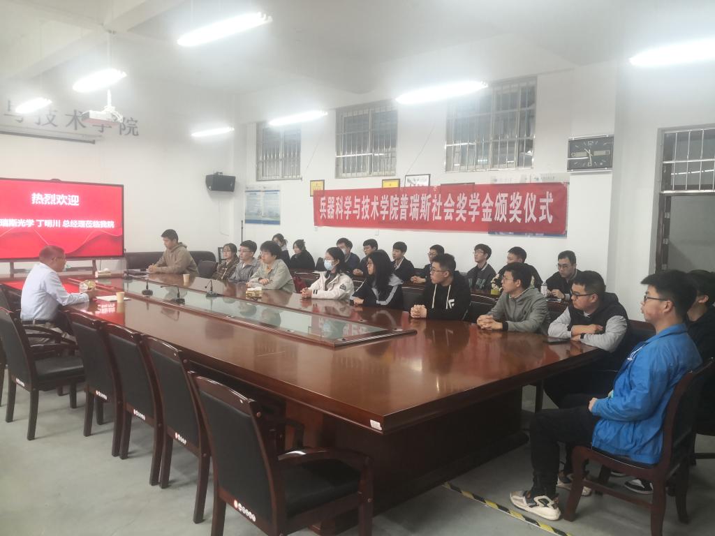 2023年4月24日早上10:30分,英国365集团官网在工6-507召开普瑞斯奖学金颁发大会,会议由辅导员王国栋老师主持,普瑞斯光学技术有限公司丁明川总经理、英国365集团官网蔡长龙副经理、2021-2022年度本科生、研究生普瑞斯奖学金获得者二十余人参加了会议。
